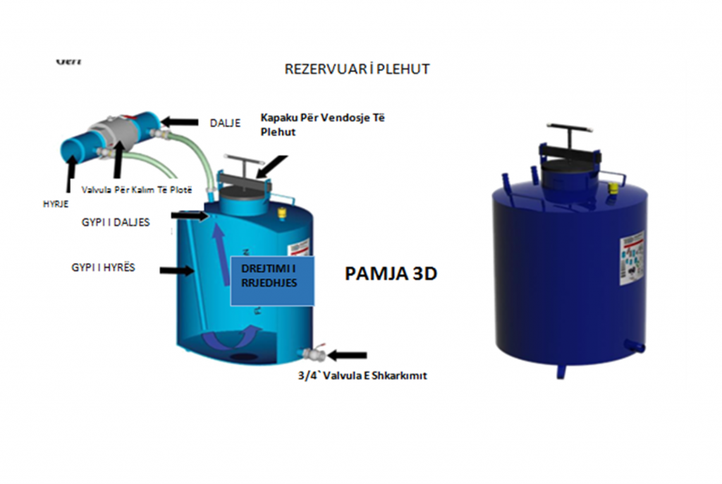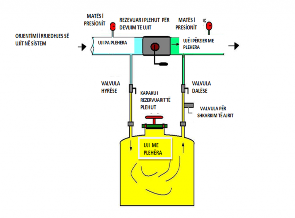 •Rezervuari i plehrave është i lidhur me gypin kryesor në dy pika me anë të valvulave mbi gypin. Njëra për hyrje të ujit në rezervuar, tjetra për daljen e ujit .
