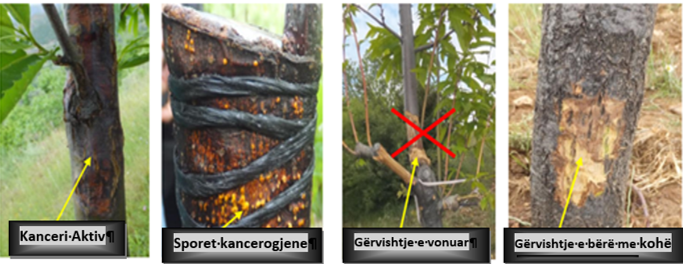 Në pjesët e plagëve, në fillim vërehet shembje, pastaj formohet bymim dhe tharjet bëhen më të theksuara. Sëmundja mund të vërehet në degë, lastarë dhe mbi qafën e rrënjës.