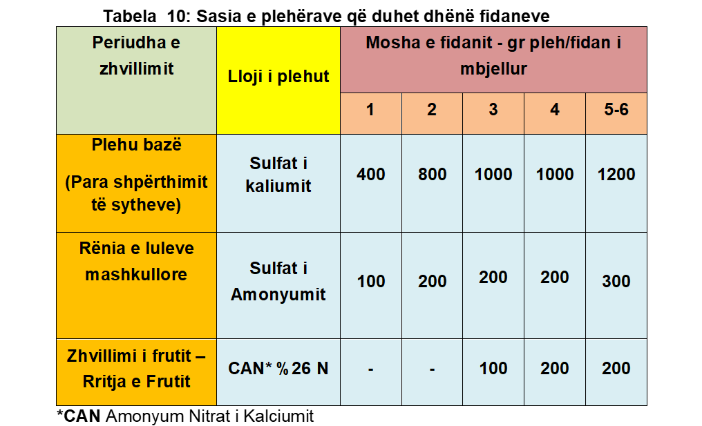 Shënime: Sasia e plehut që duhet të përdoret brenda muajit shpërndahet në ditët kur do të bëhet edhe ujitja. Derisa fidanet do të arrijnë në marrjen e rendimenteve plehërimi do të vazhdojë me riitjen e dozës çdo vjet nga 15%.