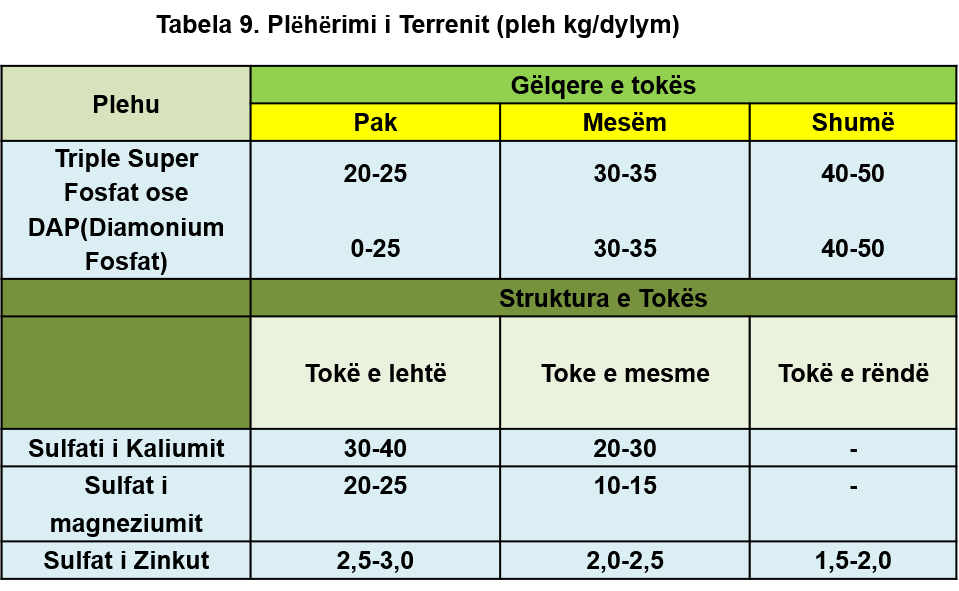 Tokat zakonisht janë të varfëra për nga kaliumi, fosori dhe magneziumi. Plehërat që përmbajnë fosfor dhe kalium nuk mund të dëprtojnë në thellësi të tokës me anë të reshjeve apo me sistemin e ujitjes. Për këtë arsyje fidanet deri sa hynë në prodhim (Sipas llojit , nga 3-7 vjec) për të plotësuar nevojën e tokës dhe për të nivelizuar elementet që ndodhen, në tërë plantacionin duhet përdorur sasi të plehërave sipas Tabelës nr.9. Tokat tona zakonisht kanë mungesë të zinkut dhe për këtë arsyje duhet përdorur plehëra që përmbajnë zink. Në tabelën e mëposhtme mund të shihni sasinë e plehërave për të bërë plehërimin e një plantacioni prej 1dylymi.