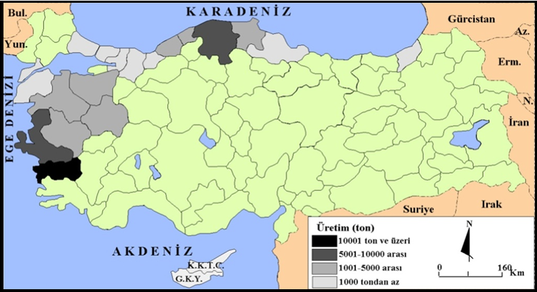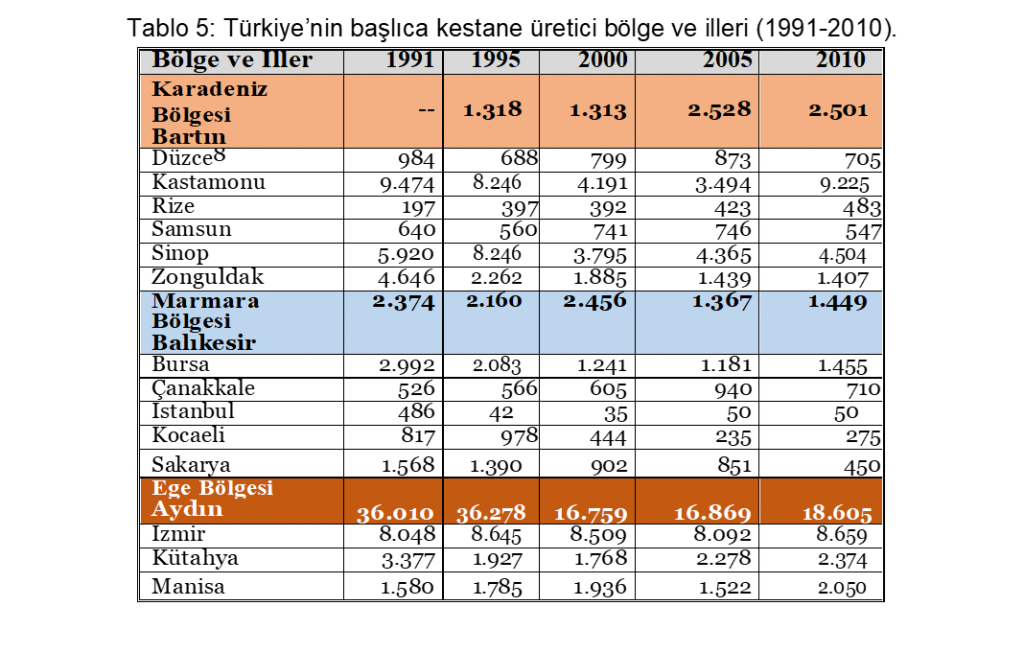 Ülkemizde kestane üretim alanları, Karadeniz, Ege ve Marmara bölgelerinde toplanmıştır (Şekil 1). Söz konusu sahada yaklaşık 118 bin dekar alanda 2.4 milyona yakın kestane ağacı bulunmaktadır. Ağaç sayısı ve üretim miktarı bakımından Aydın, Kastamonu, İzmir, Sinop, Bartın, Bursa, Balıkesir, Zonguldak ve Manisa illeri ilk sıralarda yer almaktadır (Tablo 5).