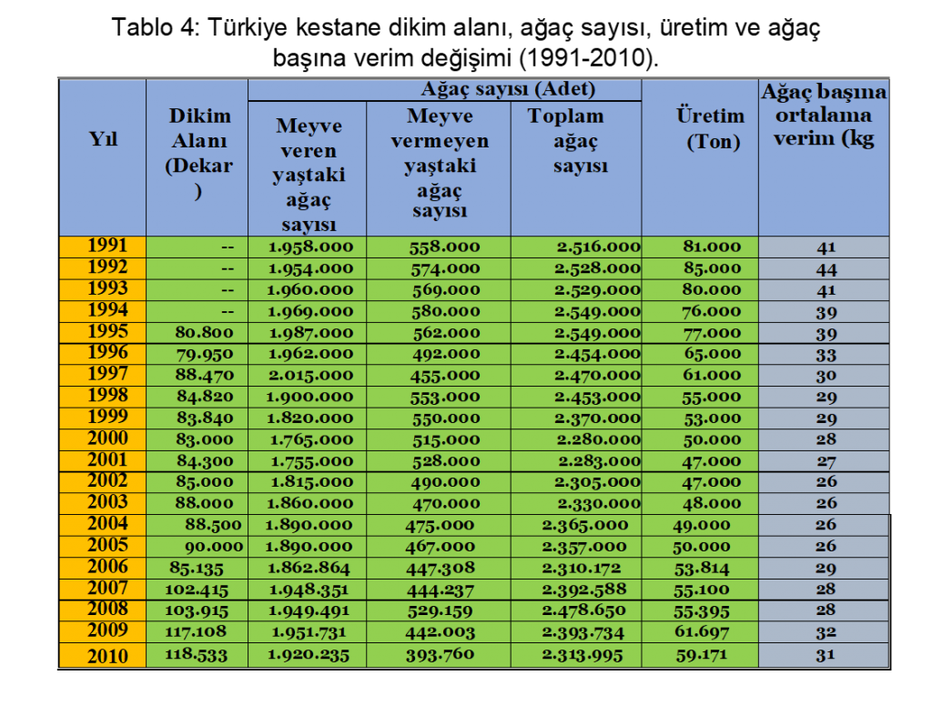 Türkiye 2010 yılı itibariyle 60 bin tona (59171 ton) yaklaşan üretimiyle Çin ve G.Kore’den sonra dünyada üçüncü üretici durumundadır. Dünyada üretilen kestanenin %3.02’si Türkiye’den sağlanmaktadır. 1961 yılında 38400 ton olan kestane üretimimiz 1992 yılına kadar sürekli artış göstermiş ve 85000 ton ile en yüksek üretim seviyesine ulaşmıştır. Ancak daha sonraki yıllarda istikrarsız bir seyir izlemiştir. Gerçekten de yıllar itibariyle kestane ağacı sayısı sabit kalmasına rağmen üretimde artış-azalışların olduğu görülmektedir (Tablo 4). Ayrıca ağaç başına düşen verimde de istikrarsız bir durum söz konusudur. Nitekim 1992’de 44 kg iken, sonraki yıllarda azalmanın olduğu dikkati çekmektedir. Bu azalmada kuşkusuz mürekkep hastalığı ve kestane dal kanserinin büyük etkisi bulunmaktadır. Dünyada olduğu gibi ülkemizde de bu hastalıklarla mücadele konusunda çalışmalar yapılmakta ise de henüz yeterince başarı sağlandığı söylenemez. Kestane dal kanseri ile özellikle Marmara Bölgesi’ndeki ağaçlar büyük zarar görmüş ve verimleri azalmıştır.