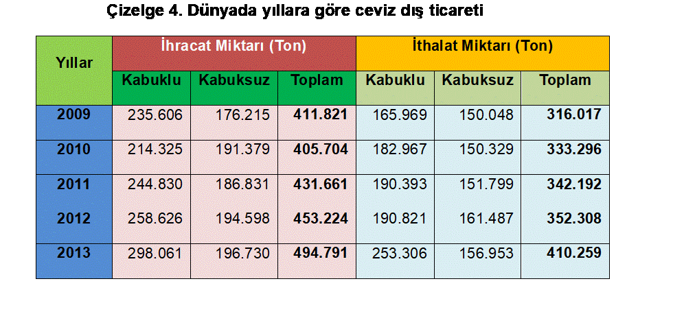 Ceviz hem kabuklu hem de kabuksuz olarak dış ticarete konu olmakta olup ceviz dış ticaretinde de yıllara göre bir artış yaşanmaktadır. İhracat miktarı (kabuklu+kabuksuz) 2009 yılında 411.821 ton iken 2013 yılında 494.791 ton olarak gerçekleşmiş olup bu yıllar arasında % 20’lik bir artış yaşanmıştır. Çizelge 4’e bakıldığında 2009 ve 2013 yılları arasında dünya genelinde ceviz ithalatında % 30’luk bir artış meydana gelmiştir.