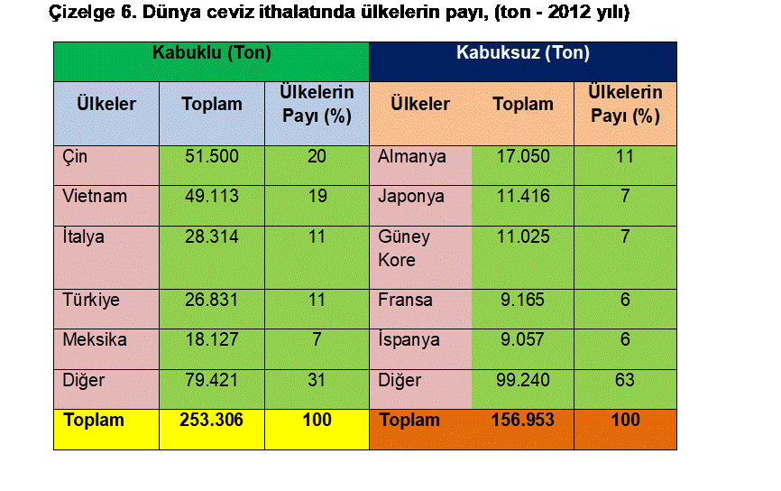 Çizelge 6’da Dünya ceviz ithalatında ülkelerin payı verilmektedir. 2012 yılında dünyada 253.306 ton kabuklu ve 156.953 ton kabuksuz cevizin ithalatı yapılmıştır. Çizelge 6’da görüldüğü üzere ceviz üretiminde dünyada açık ara lider olan Çin kabuklu ceviz ithalatında da ilk sırada yer almaktadır. Çin kabuklu ceviz ithalatında dünyadaki toplam ithalatın %20’sini gerçekleştirmektedir.