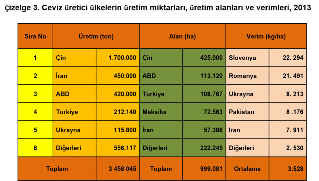 Çizelge 3’e deki üretim alanları, üretim miktarları ve hektar başına verime bakıldığında, dünyada toplam 999.081 ha alanda ceviz üretimi yapıldığı görülmektedir. Bu üretim alanının % 43’üne Çin, % 11’ine ABD, % 10’una da Türkiye sahiptir.